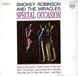 Special Occasion is an album by the American group Smokey Robinson & the Miracles, released in 1968 by Tamla Motown. It contains three Top 40 hits: "If You Can Want", "Yester Love", and "Special Occasion". Also included are versions of the Motown hits "I Heard It Through the Grapevine" and "Everybody Needs Love" (both made popular by Gladys Knight & the Pips) and the Beatles' "Yesterday". The album's biggest hit was the uptempo "If You Can Want", which just missed the Billboard Pop Top 10 (peaking at #11), and was performed by the group on their first appearance on The Ed Sullivan Show in 1968. The Miracles were actually the first group to record "I Heard It Through the Grapevine", before the later hit versions by Marvin Gaye and Gladys Knight & the Pips were done, although the master used on this album is a re-recorded version prepared following the release of the Pips' version.