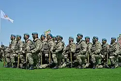 The Special Forces of the State Security Service, formerly known as the Republican Guard, was an independent service branch of the armed forces, and it currently serves to protect the residences of the President of Kazakhstan. It was established on March 6, 1992, when President Nursultan Nazarbayev signed a decree on their creation on the basis of a separate brigade of operational designation of the Internal Troops deployed in the village of Kaskelen district of Almaty region.[10] The Republican Guard was established in March 1992, when President Nazarbayev signed a decree on their creation on the basis of a unit of the Internal Troops deployed in the village of Ak Zhar in Kaskelen.[11] In May 2017, the use of the term Republican Guard was abolished by authorities, and in June 2019, its remnants were transformed into a special forces unit under the SGO.[12] The unit receives the same training as reconnaissance units and is additionally also trained in hand-to-hand combat, as well as airborne operations.[13]