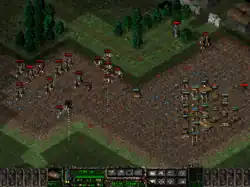 [After beginning on the back foot, after learning the basic tricks and the men rise in experience, the forces of darkness sadly start to become the underdogs. Unless they manage a surprise attack. […] Naturally, the bad guys' units have magical abilities. For example, harpies paralyze surrounding units and the living dead can crush morale and send elite troops running. The game could do with more special magic, however: it doesn't matter much whether a golem shoots lightning or a Leopard 2 fires sabots, if the practical outcome is the same. The battle system is elegant in its simplicity. Troops have action points, which they can use to move or shoot, or both. If the player leaves a unit standing still without doing anything with it, it starts to dig into defensive positions. By expending all action points a unit can heal its wounded. […] Despite their simplicity battles are interesting and not too clunky. However, I would've wanted a touch or two more versatility. The battles could be more varied too, "Kill all enemies" is too common. […] The AI is standard-level. Far-shooting units try to stay outside the weapon and vision range of enemies they've spotted, but otherwise evil just comes charging. The computer doesn't quite blunder, and it also doesn't seem to cheat - which is to say, "know" where humans are hiding. The game usually boils down to the player fortifying their main force in a good position and trying to lure the orcs to attack. The computer's strength lies in numbers, but too often its forces come in killably small groups.] - ^ a b Nirvi, Niko (October 1, 1998). "Spellcross: The Last Battle – Tää on viimeinen taisto". Pelit.