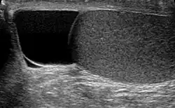 Ultrasound of a testicle (grey) and a spermatocele (black). | |