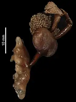 Adult female sphyriids are sessile mesoparasites of marine fishes, burrowing into the tissue of their hosts and anchoring themselves in place by expanding the cephalothorax or using a holdfast organ.[5] Species of Driocephalus, Norkus, Opimia, and Tripaphylus are parasites of epipelagic elasmobranchs, attaching to branchial or olfactory lamellae, while species of Lophoura, Paeonocanthus, Periplexis, and Sphyrion are parasites of mesopelagic to bathypelagic teleosts, attaching to body musculature.[6] Adult males are sometimes observed attached to adult females.[5]