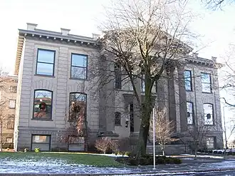 The Spokane Public Library is a historic building in Spokane, Washington. It was designed by architects Herman Preusse and Julius Zittel, and built in 1905.[2] Its construction cost $100,000, with $85,000 coming from Andrew Carnegie.[2] It has been listed on the National Register of Historic Places (NRHP) since August 3, 1982.[1] The library is one of four historic structures at the intersection of First and Cedar. To the south across First is the Grand Coulee building.[3] To the southeast across Cedar and First is the Eldridge Building.[4] All three are listed on the NRHP. Additionally, the Buena Vista Apartments across Cedar are listed as a secondary contributing property to the Riverside Avenue Historic District, to which the Carnegie Library building is listed as a primary contributing property.[5]