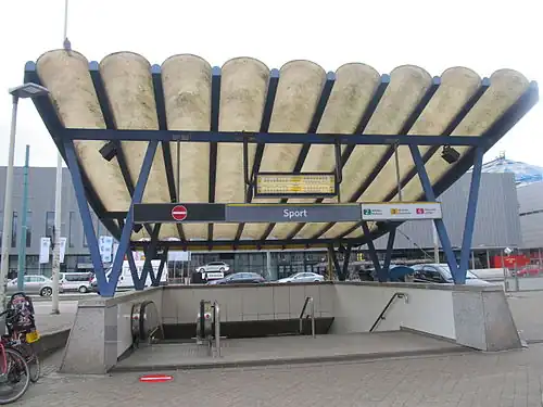 Sport is an underground station in the Antwerp premetro network. The station was opened on April 1, 1996 as the last station on the northern premetro axis. At present, the station is served by tram routes 2, 3 and 6. Tram route 5 also passes through the northern premetro axis, but leaves the premetro tunnel via the Ten Eekhovelei exit between Schijnpoort and Sport. It does not stop at the Sport station, but has a stop called "Sportpaleis" at the Ten Eekhovelei.[1]
