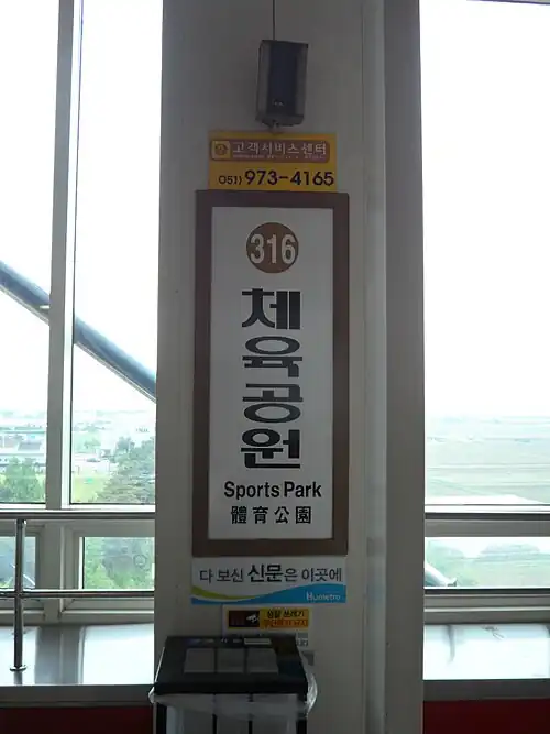 Sports Park Station (Korean: 체육공원역; Hanja: 體育公園驛) is a station of Busan Metro Line 3 in Daejeo-dong, Gangseo District, Busan, South Korea.