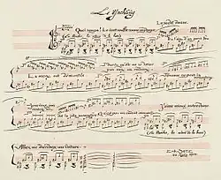 Satie was familiar with the livre d'artiste tradition. Some of the earliest examples had been published by the Montmartre cabaret Le Chat Noir while he was a pianist there in the late 1880s.[13] He found in it an ideal format for his unique interdisciplinary talents. "Keep it short" was the only advice Satie ever gave to aspiring young composers,[14] and the necessary restrictions of the Sports album - one page per composition - perfectly suited his predilection for brevity. Extramusical commentary was becoming increasingly prominent in his keyboard works of the period, and in Sports he indulged this by writing a surrealistic prose poem on each theme; he then meticulously calligraphed these into his India ink scores, in black ink for the notes and words and red ink for the staves. Whether Vogel expected these additional contributions or not, he agreed to reproduce Satie's autographs in facsimile.