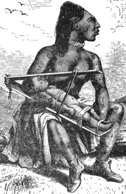 Storytelling was done through songs, which were accompanied with dances done to the beat of a drum.[1] Other importance practices included the carving of cedar canoes, the weaving of baskets and fishing nets, and face-painting done with red and black hues made from ground-up rocks.[3][1] Like the other peoples of the coastal northwest, upper-class Squaxin engaged in head-flattening, where infants had their foreheads compressed in a lateral direction.[2]