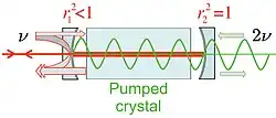 The principle of the squeezing resonator is the following: The medium parametrically attenuates the electric field inside the resonator to such a value that perfect destructive interference is achieved outside the resonator for the attenuated field quadrature. The optimum field attenuation factor inside the resonator is slightly below 2, depending on the reflectivity of the resonator mirror.[8] This principle also works for electric field uncertainties. Inside the resonator, the squeeze factor is always less than 6 dB, but outside the resonator it can be arbitrarily high. If quadrature is squeezed, quadrature is anti-squeezed – inside as well as outside the resonator. It can be shown that the highest squeeze factor for one quadrature is achieved if the resonator is at its threshold for the orthogonal quadrature. At threshold and above, the pump field is converted into a bright field at optical frequency . Squeezing resonators are usually operated slightly below threshold, for instance, to avoid damage to the photo diodes due to the bright down-converted field.