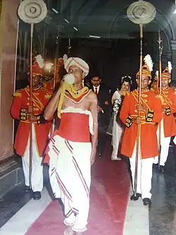 The Lascarins, which was the indigenous guard composed of soldiers who fought for Portuguese Ceylon, also served the British government during the colonial era. It maintained a marching tom-tom band that consists of flutes and seashell horns piping military music. Today a special ensemble, which reports to the Sri Lanka Navy, wears the uniforms worn by these guardsmen.