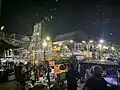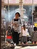 Stalls near the temple sell flowers, garlands, coconuts and incense to be used in worship, as Mariamman Temple is an important landmark for the Bangkok Tamil Hindu community, as well as a large number of Thai people. It is said that 85% of the Thais visit the temple, many believing that Hinduism is not a separate religion but a branch of Buddhism.[9][10] Religious festivals, such as Navratri, take place here following the traditional Tamil calendar in September/October. This festival, which is believed to give redress from bad luck, is held for ten days and on the final day the street in front of the temple is colourfully decorated with yellow flower garlands and candles, and the image of Sri Mariamman is taken through the streets in a procession; during this time a portion of the Silom is blocked to traffic.[6] Deepavali is also a special festival in the temple when it is brightly lit up. An oil lamp ritual is held on most middays' and on Fridays, and prasad, food blessed by god, is distributed to devotees.[1] Apart from these two major festivals, daily worships are attended by a large number of Thai Buddhists and Chinese who believe that Hindu gods help them in business and bless their women to conceive.[11]