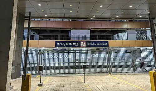 Sri Sathya Sai Hospital is an elevated metro station on the east–west corridor of the Purple Line of Namma Metro in Bengaluru, India. The station is situated near the main Sri Sathya Sai Institute of Higher Medical Sciences, Makino India Pvt. Ltd., Gopalan Golden Axis and many more.[1][2][3]