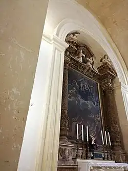 The northern altar, today dedicated to Our Lady of Mount Carmel, was originally dedicated to Our Lady of the Rosary. The old painting of this original dedication is also found in the Parish Museum, and was named by Bishop Cagliares in his pastoral visit in 1615. While the author of the current painting of Our Lady of Mount Carmel remains unknown, it was paid by Grand Master Perellos, whose coat-of-arms is included in the painting.[31] The façade of the altar is enriched by Baroque sculpture and columns, adorned with the coat-of-arms of Grand Master Cotoner. This altar also houses a statue of St. Michael, a Spanish school wood carving, which was brought to the church in the 19th century, along with another statue of St. Joseph.[31]