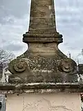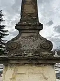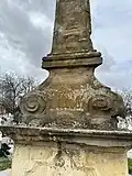 The obelisk follows a classical design in its iconography and decoration, featuring a pyramidal shape with three sides. The base supports the upper part, which culminates in a pyramidion and crucifix. The middle section is adorned with prominently sculpted volutes framing Latin inscriptions that reference the time and purpose of the monument's construction. Decorative borders are visible on the base, and a cartouche embellishes one of the pyramid's faces at the top. The creator remains unknown, and there is no record identifying the donor.[8]