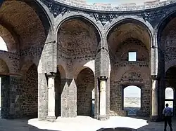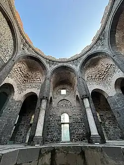 The western chamber is more spacious than the eastern one and its dome was higher.[3] The dome had partially collapsed by the early 20th century.[3] It was supported by eight piers, still standing today, between which are high arches. The four arches aligned with the dome's two central axes each form part of an iwan, while the arches at the four diagonal corners of the dome contain squinches. Some muqarnas masonry is found in the squinches, while the shallow pendentives between the eight arches are decorated with muqarnas stonework similar to that found on the Artuqid towers of the city walls.[3] Behind these arches, and running around the chamber, is a corridor covered by oval vaults. This corridor once surrounded the chamber on all four sides, but its eastern wing has since been walled off to form a separate narrow chamber between the main western and eastern chambers.[3] The former dome, the squinches, and most of the vaults are built in brick, while the supporting arches are made in stone.[3]