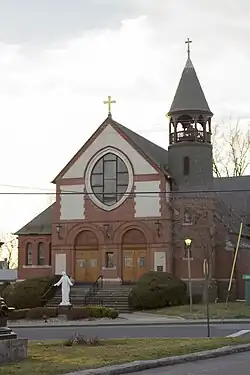 The church at Fishkill Landing began as a mission of St. Mary's in Wappingers Falls, but was later transferred to St. Joachim's in Matteawan.[5] The parish was formed in 1887. Rev. John Hurley was appointed as the first pastor. The first Mass was celebrated on that Christmas. The original St. John's Church was the old Swift's Hall. It was dedicated by Archbishop Corrigan in 1888, but burned to the ground in 1890. After the former opera house burned services were held for a time, in a printing-office and later over a livery stable.[5] The "Elm Tree" property was purchased from Lewis Tompkins for the new church. Rev. John J. McGrath was appointed in 1890. The present St. John's Church was built in 1891.