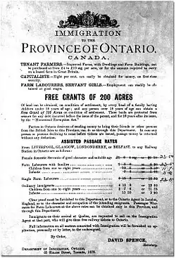 Beginning in the mid-1850s, population growth of the island began to shift from the south and west to better agricultural land in the north.[41] Government policies including the Free Grants and Homestead Act of 1868, encouraged would-be farmers in the south of Ontario to relocate to tracts of land in Algoma by providing up to two hundred acres of land per head of household.[42] The greatest influx of settlers came between 1874 and 1882.[43]