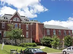 The Classroom/Dormitory building, also known as St. Mary's Hall, was built as an addition to Cambria Place from 1884 to 1885.[2] It is a two-story, rectangular plan structure built on a high basement. Designed in a late Victorian Eclectic style, it is capped with a high hipped mansard roof. It features large gabled wall dormers and small wood roof dormers. Round arch windows are found in the roof dormers below a pediment. Both the wall and the roof dormers have gable roofs that are flared at the eaves. The cornice is broad and it is decorated with large fan-shaped wooden brackets.
