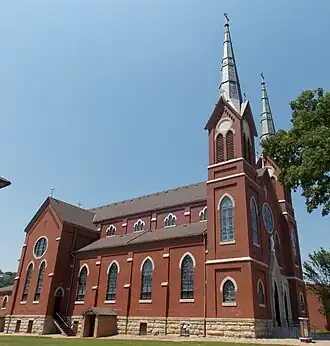 The parish was established in 1851.[2] The parish's first church building was a 20-by-28-foot (6.1 by 8.5 m) frame structure built in 1851 on the north side of town.[3] A 30-by-50-foot (9.1 by 15.2 m) brick church was constructed two years later and the original frame church was converted into a school. Plans to replace it began in 1865, but disagreements about where to build it doomed the effort. Eventually, it was decided to relocate the parish property and a new stone church was completed in 1874.