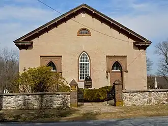 Founded by the Rev. Levi Bull, DD, in 1805,[3] the first church here was built in 1806. J.F. Sachse, of the Historical Society of Pennsylvania, believed it to be the first church built in Pennsylvania after the American Revolution. A notable military officer Samuel Van Leer played an important role in the American Revolutionary War and is buried here.[4] Dr. Bull continued to minister to the congregation here for almost 50 years.[5] During Dr. Bull's tenure, in 1843, the original church was replaced by the present structure.