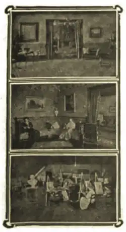 Many of the rooms were elaborately furnished. Among those more particularly noticeable were the Rector's studio (which alone cost US$1,200 to fit up), the reception parlor, the art studio, library and study hall. These were adorned with many rare works of art, among the principal of which were, a copy of Bartolomé Esteban Murillo's Madonna and Child of the Napkin, from the Pitti Palace, Florence, Italy (this copy was the size of the original, and was encased in a richly-carved Florentine frame); a copy of Correggio's Mystic Marriage of Saint Catherine, from Naples; a portrait of James Knox, copied from George Peter Alexander Healy; copies of Fra Angelico on gold; pen drawing of George Washington by Dr. Leffingwell; and a copy of Raphael's St. Cecilia. Other rare works of art also grace the walls, almost all of which were procured by Dr. Leffingwell while in Europe.[1]