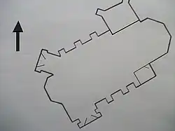 The church was basilican in plan with a central nave leading to the chancel, which contained the sanctuary and the choir. The baptistery (or baptistry) was at the entrance end of the church.[10] The church, in keeping with the ancient ecclesiastical tradition, was oriented towards the liturgical East, with its main apse at the East (the altar placed there), and the baptistery at the West apse.
