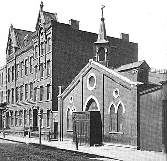 The church was originally established in 1873 to serve a German Catholic population.[1] It was a mid-block gable-fronted brick single-cell building with Romanesque details located at 529 E 17th Street. In 1877[2] the parish added a rectory at 527 E 17th Street[3] and a school at 523 E 17th Street.[4] The next year, the Sisters of St. Dominic began operating the school. Their convent was located north of the school at 526 E 18th street.[4] All buildings were demolished in the early 1940s to make way for Stuyvesant Town–Peter Cooper Village.