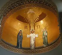 The parish was established in 1886. Prior to the formation of St. Monica, the nearest Catholic church was at Olvera Street in Downtown Los Angeles.[2] The current church opened for Christmas in 1925. At the time, the Los Angeles Times reported: "The opening of St. Monica's Church, ranked in the cathedral class and probably the finest Catholic Church of its kind on the Pacific Coast, will be celebrated with solemn high mass at 5 o'clock Christmas morning. For the first time the interior splendors of this remarkably beautiful and dignified religious edifice will be revealed to St. Monica' parish, and many out-of-town visitors are expected."[3] The church was not officially dedicated until July 1926, at which time the Los Angeles Times reported: "A crowd numbering many thousands surrounded the handsome limestone structure on California avenue and Seventh street, the overflow standing under the towering eucalipti of the city park opposite the church. ... Strains from the great pipe organ of St. Monica's floated to the overflow crowd outside to give at least a hint of the sacred services within."[4]