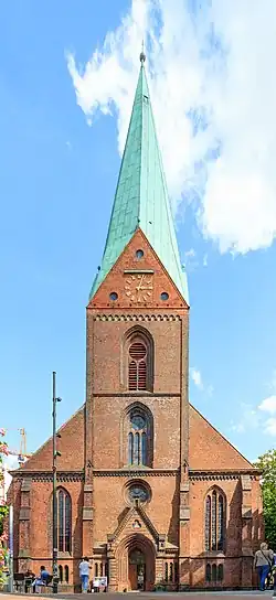The building was begun shortly after the foundation of the town by Adolf IV of Schauenburg and Holstein, c. 1242.[2] The church is first mentioned in a document of 1246,[3] dedicated to Saint Nicholas, the patron saint of seafarers and merchants.[2] The original Gothic hall church was changed hundred years later, following the model of St. Petri, by adding a long choir, and building three naves. The steeple was connected to the church by the annex of chapels.[3]