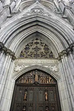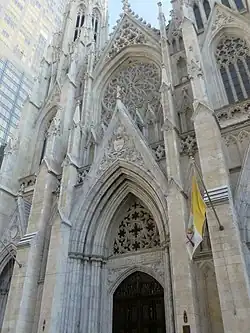 The cathedral's masonry was laid during summer as the stonework could not be laid in the cold.[50] By late 1870, the marble walls had been built to a height of 54 feet (16 m) and the transept was finished.[50][62] The entrance on Fifth Avenue, measuring 70 feet (21 m) tall, had also been finished.[62] Over a hundred workers were busy quarrying marble from Pleasantville, north of New York City. The marble was transported down to New York City via the Harlem Railroad, where a branch track led to the new cathedral's site.[50] The construction of the new cathedral drew relatively little interest for New York City's non-Catholic population,[63] though several commentators praised the cathedral's design.[31] An anonymous author for the Real Estate Record and Guide wrote that the new St. Patrick's Cathedral was the "most gorgeous ecclesiastical edifice on this continent", though the critics perceived the buttresses on the north and south sides of the facade as "altogether unnecessary".[64] A reporter for the New York World, probably Montgomery Schuyler, wrote in 1871 that the cathedral would be "one of the leading ecclesiastical structures in the world".[31]