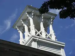 The parish hall features a 45-degree turned corner tower and entryway. At one time it was capped with a spire.[3] Elaborate shingling is found in the gable end, below the lancet windows on the main facade, and on the tower. A row of Maltese crosses are located at the cornice level of the tower. Three lancet windows line the side walls.