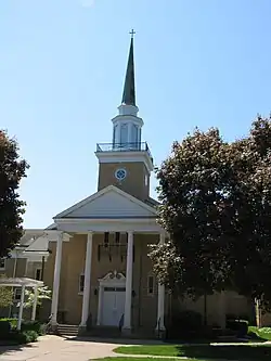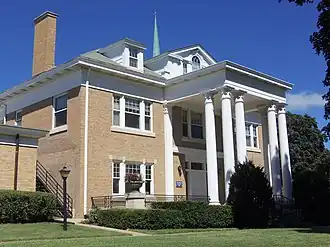 By the middle of the 20th-century, the congregation outgrew its facilities yet again. This time the congregation chose to relocate further north and acquired property across Lombard Street from Vander Veer Park,[6] and across Brady Street from the Outing Club. On the property was the E.C. Mueller House at 2136 Brady Street. The Georgian Revival home was designed by the Davenport architectural firm of Temple and Burrows.[7] It was incorporated into the new church complex and housed administrative offices. It and another small house along Lombard Street are contributing properties in the Vander Veer Park Historic District. In 1952 a new sanctuary was built in the Georgian Revival style on the corner of Lombard and Brady Street. It contains 5,500 square feet (510 m2) of space.[8]