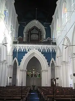 Three stained glass windows located at the apse are dedicated to three figures in Singapore's early colonial history and who are represented on the windows by their coats of arms. The window at the centre is dedicated to Sir Stamford Raffles, the windows on the left to John Crawfurd, the first major Resident of Singapore, and the windows on the right to Major General William Butterworth, the governor who initiated the construction of the second church building.[19] However, the original stained glass windows were damaged during the Second World War.[6][20] MacPherson is remembered in the grey and red granite memorial monument surmounted by a Maltese cross in the grounds, and by the stained glass window over the west door. Jalan Klapa was also renamed MacPherson Road in his honour. The gallery at the West end was not part of MacPherson's plan but added after the Cathedral opened. It has the only decorated elements in the church, with foliated pillars and pilasters, and crocketed arches.[6]