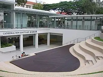 A project to extend the building was initiated in 2003. An archaeological excavation was conducted on its grounds in 2004 by the National University of Singapore before building commenced.[12] The extension, called the Cathedral New Sanctuary, was completed in November 2005. It was largely built underground to comply with conservation guidelines for a gazetted national monument, and features a new worship hall within two underground levels of new floor space.[5]