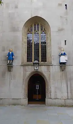 The same statues from the Foundling Hospital located in Hatton Garden are above the side door of St Andrew Holborn. Thomas Coram is buried here, his remains were translated from his foundation in the 1960s