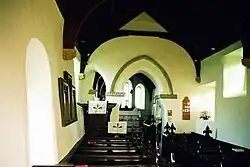 The internal walls are largely rendered, with some ashlar detailing. The roofs have arch-braced collars on carved stone corbels, and the chancel's purlins use diagonal bracing.[3] The chancel arch has 12th-century origins but with later modifications including the rebuilding of the arch and the addition of an opening on the north side leading to the pulpit, probably carried out in the 17th century.[4] The chancel's south wall has a 12th-century piscina in a 19th-century recess, and the sanctuary has paving using 19th-century encaustic tiles.[3]