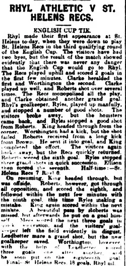 The Recs were regular FA Cup entrants over the period, but never made the first round proper. It twice reached the fifth and final qualifying round (equivalent in 2025 of the second round), in 1902–03 and 1907–08. In the former season, the club lost 5–0 at Glossop, conceding 4 late goals, and having missed a penalty to make the score 1–1; en route to the fifth round, the Recs beat town rivals St Helens Town in the second round before 5,000 fans at City Road,[12] put a remarkable 18 goals past Rhyl Athletic in the third, and upset Burslem Port Vale in the fourth.[13] In the latter season, the Recs lost 4–1 at home to Chesterfield.[14]
