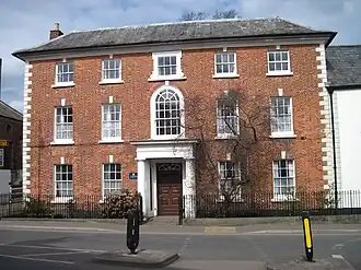 St James House was grade II listed on 27 June 1952.[10] The listed building has an 18th-century facade with a three-storey, five-bay elevation. The exterior is red brick, highlighted by light-colored, raised stone quoins which serve as the cornerstones of the walls, contrasting with the brick.[8] Decorative keystones of similar material are atop all of the windows except one, which is lugged and scrolled.[2] The bays on the ground and first floors are rectangular, while those on the uppermost floor are square. The exception is the tall, centre window on the first floor which is round-headed.[2] The centrally-positioned entrance features a wood portico supported by Doric columns. A fanlight is present above the door.[8] The roof is flared and hipped. The interior has a small amount of 17th-century plasterwork.[2]