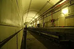 The southern tunnels were modified during World War II to serve as a public air raid shelter.[5][10] The abandoned air raid shelter begins in the single track section of the southern end of the station and continues into the two single track tunnels beyond. At the station end the air raid shelter is protected by a blast curtain and the doorways and openings for ventilation between the chambers, each about 30 metres long, are protected by blast curtains.[1][10][15]