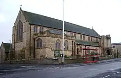St John's Church originated as a mission church in the Old Butts Chapel in 1881. In 1898 a new church was built, and in 1908 St John's became a separate parish. It was decided to build a new church, the foundation stone of which was laid on 27 May 1911.[2] It was designed by the architects Austin and Paley of Lancaster.[3] The new church was consecrated on 1 October 1912 by the Rt Revd Edmund Knox, bishop of Manchester. There had been plans to build a west tower but, when the funds were raised for this in the 1950s, it was discovered that the foundations were inadequate, and a new northwest porch was built instead. This was opened in 1961.[2] The church was declared redundant on 1 March 2006, and was demolished in 2009.[3][4][5] Its reredos was moved to St Margaret's Church, Oldham.[2]