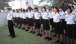 Cadet members are presently only entitled to wear the Ceremonial and Field Uniform, the latter of which is also the most widely recognised uniform of the St. John Brigade Singapore. The Field Uniform consists of a black beret with a cap badge, depending on which is entitled to the wearer. Nursing members wear a hairnet as well. The top consists of a white short-sleeved shirt / blouse with plastic concealed buttons. For female members, due to the white uniform, bras should be of decent colours if worn. Shoulder flashes bearing the Maltese Cross with twin lions and unicorns, together with the words "St. John Singapore" are worn on both sleeves. A black epaulette is worn on both shoulders denoting the rank of the member. The bottom consists of black pants / culottes, which is worn with the St. John belt. Black socks and black low-cut boots are worn with the shoelaces tied in the formal-style.