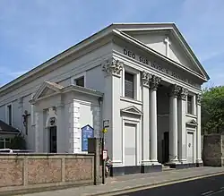 William Hallett, the architect, is not known to have been responsible for any other buildings in Brighton or elsewhere,[4] and he based the design of St John the Baptist's very closely on that of St Mary Moorfields in London, completed in 1820.[8] In particular, the southern frontage – which faces Bristol Road – is almost identical to that of St Mary's. The church is Classical in style, with a stuccoed exterior and a large pediment above the entrance.[4] The shallow roof is made of slate. The entrance porch is flanked by two columns with accompanying pilasters, and there are two more pilasters at the corner of the building. Blind doorways between the two sets of pilasters have small pediments and two deep-set windows above them. Below the main pediment and dentil cornice is a Latin inscription: DEO SUB INVOC. S. JOANNIS BAPT. ("To God, under the invocation of St. John the Baptist.") There is a side entrance in the western face, again with a pediment above it.[4][8]