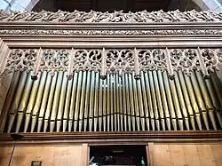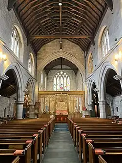 The architectural style is Gothic Revival. The plan of the church consists of a four-bay nave with a clerestory, a chancel with a chapel, and a tower at the southeast corner.[2] Along the sides of the nave are three- and four-light windows.[6] The massive square-plan tower has a slate-covered pyramidal roof, and originally sported four lucarnes. Inside the church the arcades are carried on alternate octagonal and circular piers.[2] The heavily carved rood screen featuring a large number of animals and birds was designed by H. O. Tarbolton, and the font is a copy of a 15th-century font in Suffolk. The pipe organ, originally a house organ belonging to a Mr Robb of Glasgow in the 1850s, was built by J. and A. Mirrlees of Glasgow[7] and substantially rebuilt by that firm in 1914.