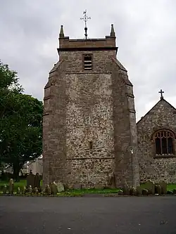 The churchyard is oval in shape and contains the base of an old cross and the stone plinth of a former sundial. To the east of the church is a lych gate, adjoining which is a hearse house dating from about 1810.[3] The hearse house, together with the churchyard walls and the lych gate were designated as a Grade II listed building on 16 October 1995.[5]
