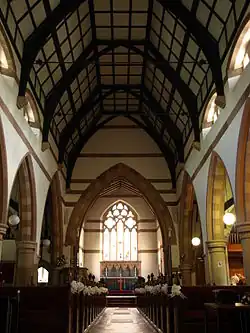 The church is cruciform, and the nave has a clerestory and north and south aisles with four-bay arcades.[5] The clerestory windows are quatrefoils set in groups of three.[6] Internally the walls are plastered, and the plastering is punctuated by horizontal bands of sandstone. In the transepts and nave the roof timbers are exposed and in the chancel they are gilded and painted in heraldic colours of red, blue, green, white and gold.