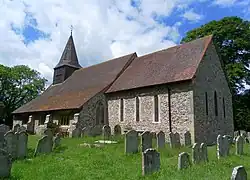 The church is a mostly flint structure with some ashlar and brickwork. It has a chancel, nave with north and south aisles, porch, tiled roof, and a shingled spire which sits on top of the weatherboarded belfry.[1][9] Part of the nave has been converted into a vestry and other rooms.[1] The entrance door at the west end is now the only part of the church where any pre-Norman masonry can be seen.[3] The 13th-century chancel retains its original lancet windows,[3] but other windows elsewhere in the church were renewed in the 15th century. Many have since been replaced. The windows in the north porch have trefoil openings at the top.[1] The nave roof had a Saxon cross-gable until the restorations of 1903.[1][2]
