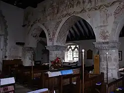 The church consists of nave, chancel and a south aisle separated from the nave by a three-bay arcade. The chancel arch is in the form of two arches, one inside the other, designed to accommodate the 5-foot (1.5 m) thick east wall, which supports the belfry.[8] The pointed arches of the south arcade are supported by round piers with varying capitals. In the angle of the chancel and south aisle there is an early thirteenth-century chapel.[8] Two round-headed Norman windows remain; the west window of the south aisle and the centre window in the north window of the chancel.[5][8] The chancel east window has the only stained glass in the church.[5] The "fantastically long"[4] hagioscope, about 9 feet (2.7 m) in length and resembling a tunnel, runs from the south aisle into the chancel through one of the pillars of the arcade and the chancel arch. These architectural features allowed worshippers in the aisle to see the bread and wine being consecrated during the Celebration of the Eucharist.[6] The church is roofed with Horsham slabs, a common material in churches in the area.[5] The oak shingled spire of 1602 rests partly on the masonry of the old belfry, or bell turret, and partly on the east wall of the nave.[5][8]