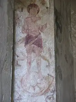 In the splay of the north nave window is a 14th-century depiction of Christ standing on a wheel and surrounded by the tools of different trades. He has his arms raised, apparently to better display his wounds. The tools include tailor's shears, a butcher's cleaver, a carpenter's square and a weaver's shuttle. Above Christ's right shoulder there are two dice.[5] Similar paintings are found in many other medieval English parish churches. The subject has been much discussed in the past but has been conclusively identified as a warning against breaking the Sabbath.[15] The message is that by working on Sunday one inflicts new wounds on Christ.[5][15]