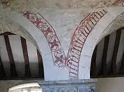 The oldest significant painting is a medallion at the east end of the south aisle. Uncovered in 1967 this has a central design of a cross in the form of an endless knot of rope. The south aisle also has 12th-century pictures of angels and Apostles.[5]