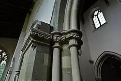 Around AD 1200 the separate porticus were knocked through and extended westward as north and south aisles, running the length of the nave and partly overlapping the west tower. The north aisle seems to have been built first, with the south being added very slightly later. For each aisle a fine three-bay Early English arcade with moulded arches was inserted in the nave wall.[4] At an unknown date the apsidal chancel was demolished and the chancel arch walled up.