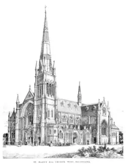 The foundations of the current church were laid in June 1892. A young and as yet unknown architect, Edgar J. Henderson, tendered plans for a grandiose sandstone cruciform in the French Gothic style. At 53 metres (175 ft) long and 29 metres (94 ft) wide, the proposed church was criticised by Archbishop Thomas Joseph Carr for being too large, but parishioners embraced the ambitious project. Within a year, however, economic depression had wrought havoc on the project's finance. Remarkably, in the face of devastating poverty, parishioners managed to fund ongoing construction, and church was built in eight years.