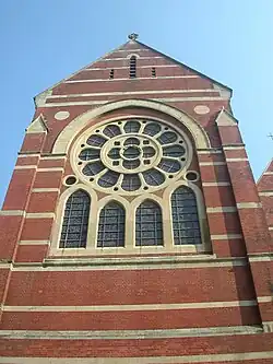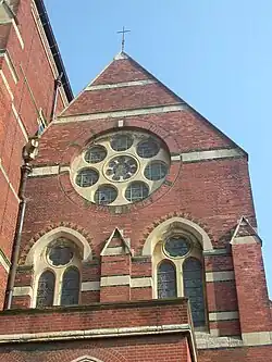 The exterior decoration of the new building broadly matched that of the original church, consisting of bands of white stone contrasting with dark red brick, but there is a considerable difference in height. The original building's north aisle was demolished, and its remaining structure became the south aisle of the new church. In terms of the church's present arrangement, therefore, the main body and the adjacent north aisle date from 1893, while the south aisle is original.[11]